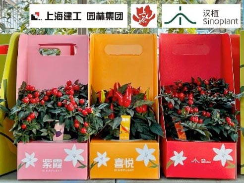 上海園林(集團)有限公司領銜旗下“虹橋花市”與“上花源”兩大花卉品牌精彩亮相。作為鏈接“名優新”花植園藝產品的專業平臺,滬上傳統知名花市“虹橋花市”攜手品牌“研植無限”,以市花“白玉蘭”為創作靈感,推出了“無需澆水、自行開花”的“青花白玉”朱頂紅蠟球禮盒(圖1),在造型上也顛覆了以往的標準球體,將青花瓷八棱罐的經典瓶型融入其中,打造極具上海特色的創意花禮。“上花源”帶來多次榮獲全國大獎的觀賞辣椒“紫霞”、“喜悅”、“紅寶珠”(圖2)和2026年才會上市的新品種——迷你型羽衣甘藍“名古屋櫻吹雪”、“寒羽白色”、“寒羽紅色”等多款特色產品,經由上花源園藝師的巧手制作,為展會定制限量版組合盆栽(圖3),向廣大消費者展示。