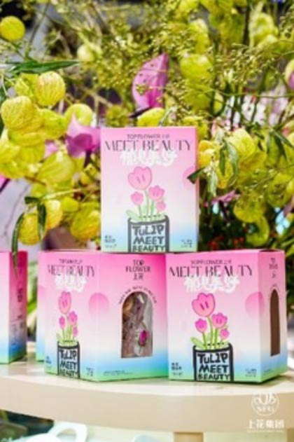 年宵花不僅好看,還可以很好玩。上海種業(集團)有限公司特別推出了一款水培郁金香套裝(圖4),打破了傳統年宵花單純觀賞的局限,為節日增添了更多互動與意義。這種創新的水培種植方式集美觀與便捷于一體,十分適合家庭栽培。通過水培形式,消費者不僅可以直觀地觀察到郁金香根系的生長過程,親身感受植物生命的神奇,還能參與其中,體驗養花的樂趣,為生活增添更多情趣。相比傳統的土培花卉,水培郁金香既美化了居家環境,又寓教于樂,具有較高的觀賞價值和教育意義。